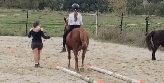 Séance de jeux à poney pour apprendre les fondamentaux de l’équitation : avancer, s’arrêter, tourner.